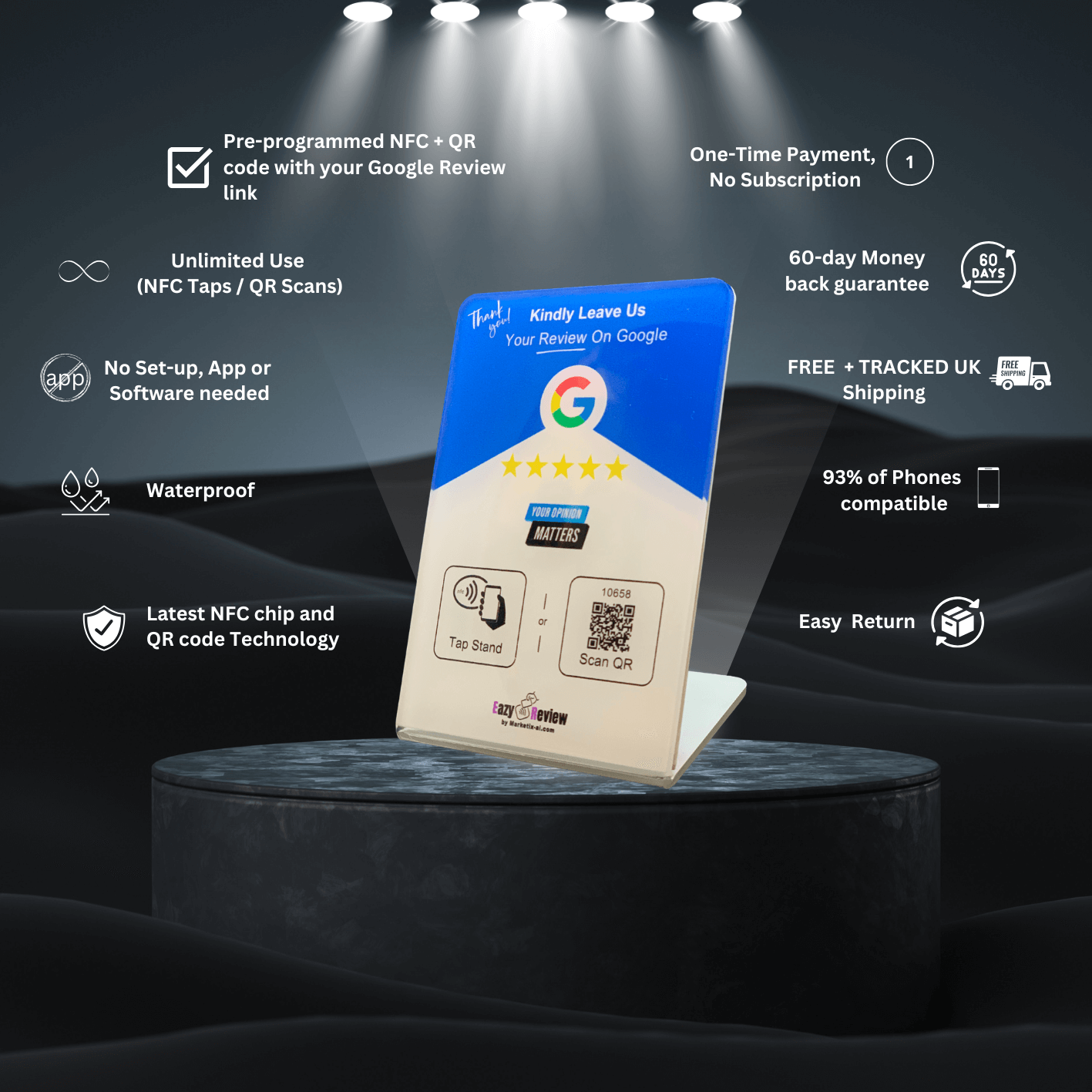 Ready to use: Stand comes pre-programmed with your official Google Review link.
